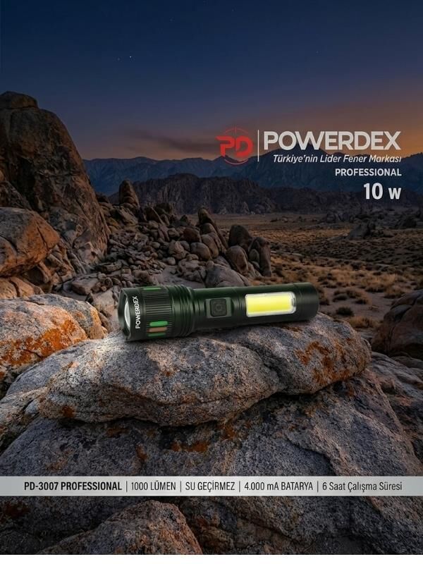 - Powerdex PD-3007, hem profesyonel hem de günlük kullanım için tasarlanmış, 1000 lümen ışık gücüne sahip yüksek performanslı ve şarj edilebilir bir el feneridir