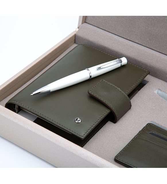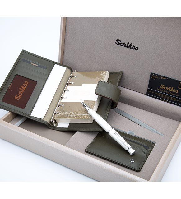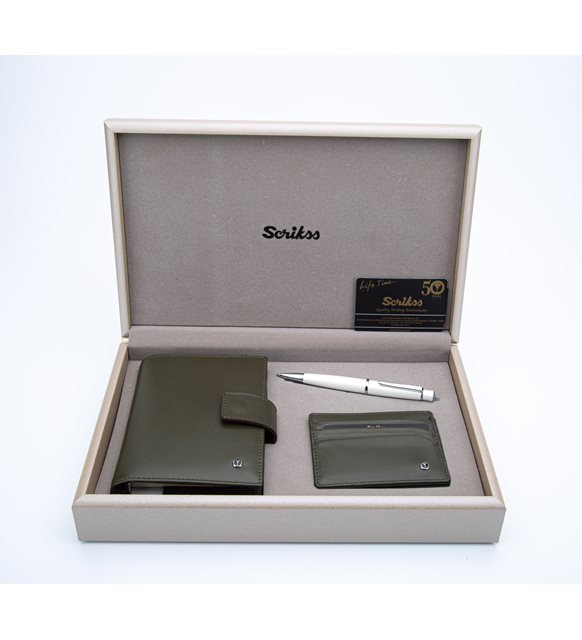 Scrikss Hediyelik Set Tükenmez kalem 62 Chic Beyaz & Deri Cep Ajanda - Kredi Kartlık Haki