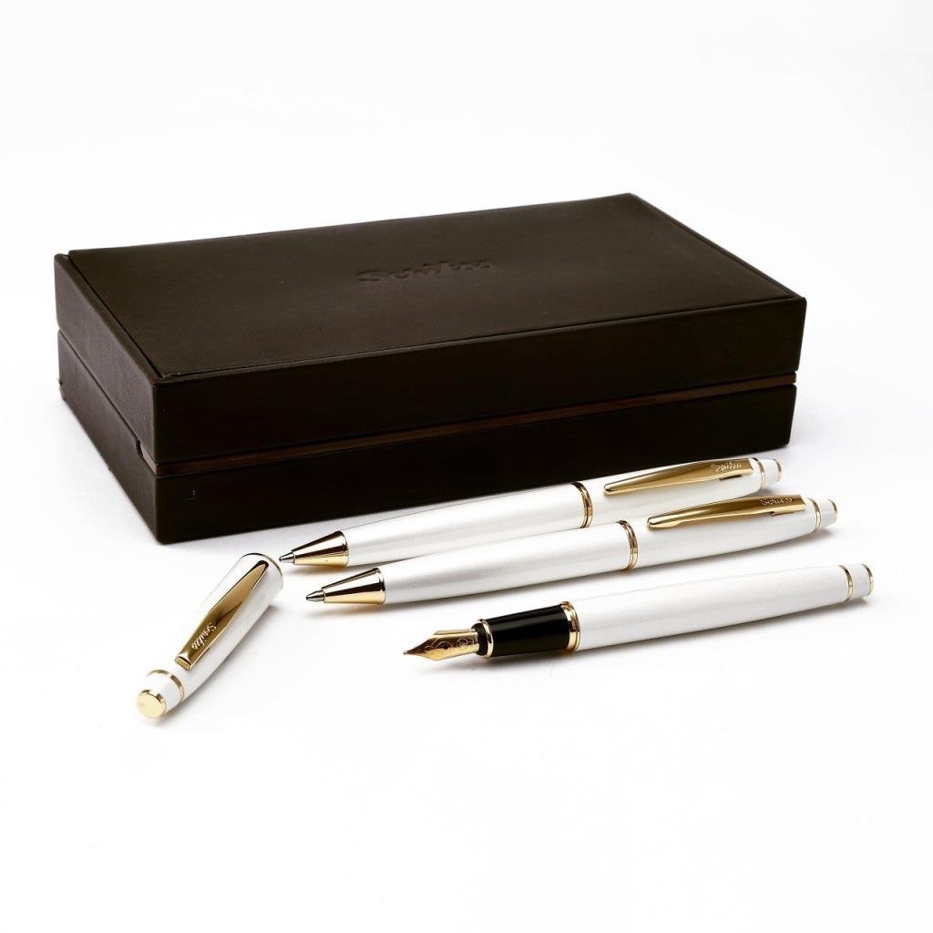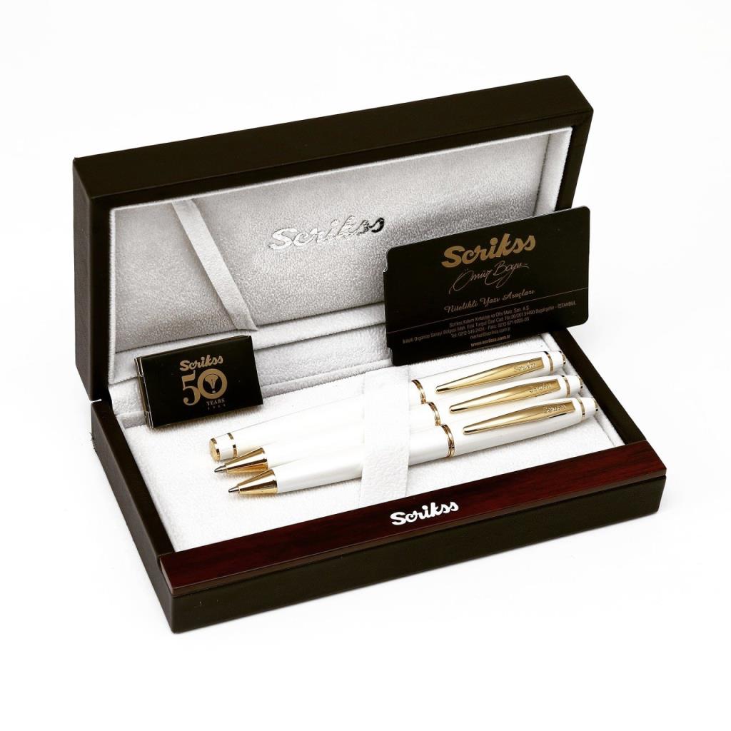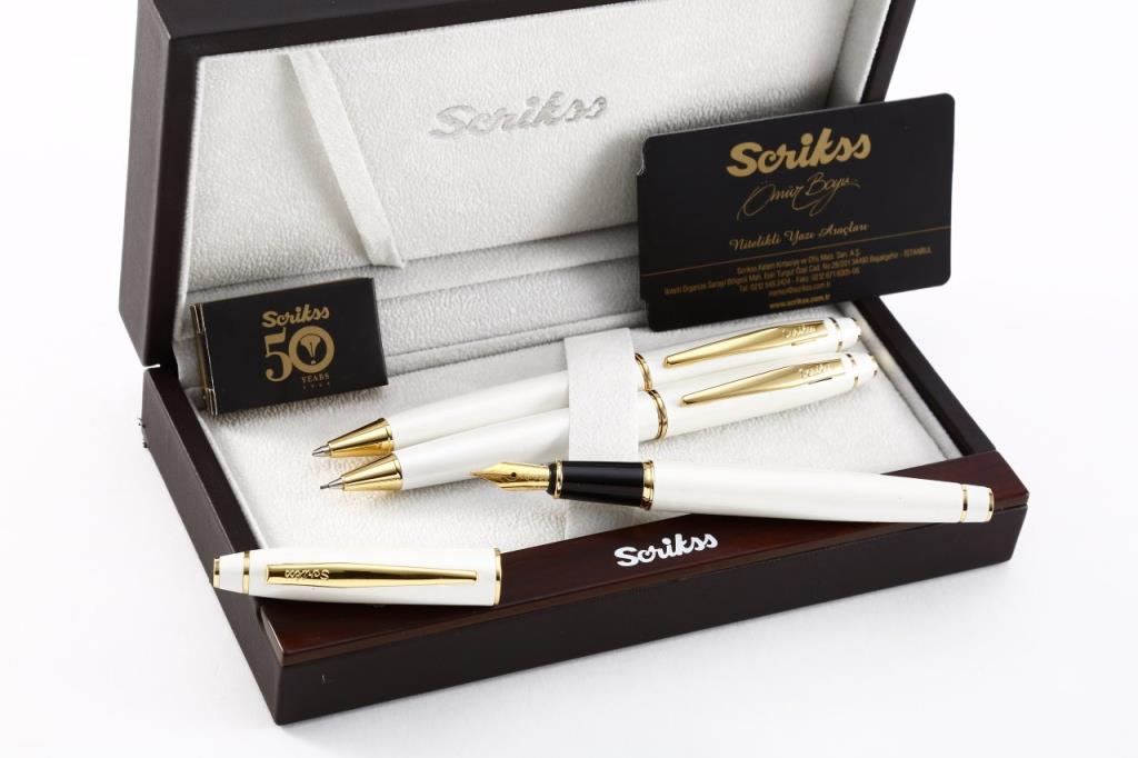 Scrikss Marka Dolma Kalem , tükenmez kalem ve versatil kalem seti İnci beyaz kasa ve kapak Altın Kaplama klps halka ve uç Dolma kalem Altın kaplama iridyum noktalı çelik uç Piston ve kartuş sistemi , Çevirmeli otomatik mekanizma Standart dev G2 tükenmezkalem refil , Mekanik Kurşunkalem Çevirmeli otomatik mekanizma Tepede gizli silgi 0,7 mm uç Lüks Deri Kutusunda Lazer markalama ile kişisel ürün Ömür Boyu Scrikss Garantili , garanti belgesi kutu içerisinde gönderilmektedir